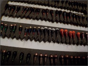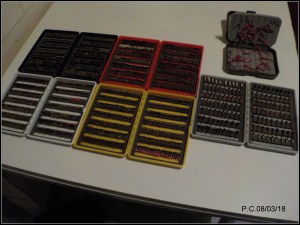 Vue d’ensemble ; 1 boite de 2.5…2 de 2.8 (que j’utilise le plus), ..1 de 3.2 …1 de 4 …et 1 boite de WARM déclinée en 4types de lestage (2.5/2.8/3.2/4) uniquement dans la couleur du ver de terreau …