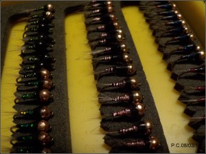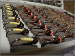 Je ne dérogerai pas au partage de mes  montages perso, via les réseaux sociaux, dans un souci d’aider le débutant, je vous livre mon process  de montage et de classement que j’ai adopté et qui me convient. De la méthode, des montages classiques, séances rébarbatives en divers lestages, ou la créativité est limitée ! Je classe mes montages dans des boites peu onéreuses et identiques de couleurs différentes avec inscription sur chacune du lestage . Pour ma région j’ai opté sur ce type de classement en fonction d’une synthèse empirique au regard de mon humble pratique et expérience sur la Sioule, Alagnon, Allagnon, Allier, Couzes, Morge, Chavanon, Ance du Nord, Vézère, Dordogne…