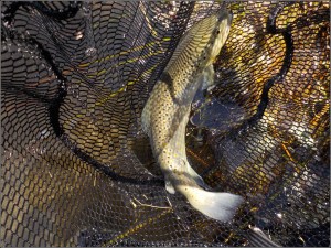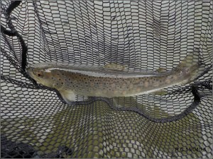 Se mettre à l’écart et lancer et ramener sans cesse ; une technique particulière pour ce lac . Une légère aspiration, ferrage et fario à l’épuisette , taille aux alentours du 30 ++