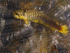 Un peu plus loin l’éclosion me procure la joie d’un gobage discret, sans doute un ombret me dis-je . Je pose ma mouche amont et aspiration , ferrage et a ma stupeur ce n’est pas un ombret mais une vigoureuse fario . Celle ci me fait le pire des scenario, elle fonce droit sur moi …durant un dixième de seconde je repense à cette belle arc perdu en fin de saison dernière sur le Haut Allier qui m’avait cassé ainsi. Mais aucun mou et la canne travaille bien et épuisette …