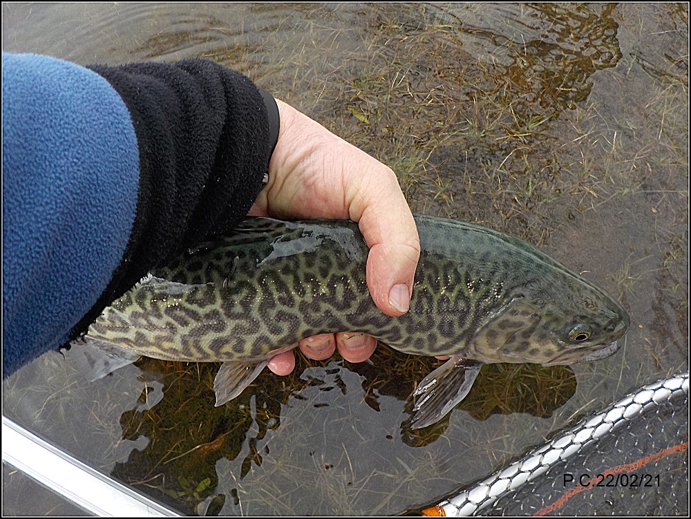 Journée de repos et fin des vacances en Auvergne, les truites du Domaine des Gerris ont logiquement « dérouillées »…J’arrive dans la matinée sur le site sous des bourrasques de vent. La pêche sera délicate, un poisson en arrivant , une autre puis plus rien sur ce coté du lac…Pas de pêche à vue possible, le vent redoublant de puissance, j’opte pour mes « streams « préférés, avec inexorablement ma très vielle soie intermédiaire de chez Cortland, soie que je retrouverais pas l’équivalent en terme de durée au moins 15 ans …Les jaunes comme d’accoutumée me snobe, bien que j’en rate une … Je continue ma prospection sans rien de bien concluant, testant divers options, puis je reviens sur les basiques et classiques streamers en diverses tailles et puis un suivi, « lift » en revers à cause de ce satané vent et ferrage à retardement compensé je ne sais comment mais ce magnifique poisson robe « tigrée » rejoint l’épuisette. Un poisson superbe du Domaine du Gerris.