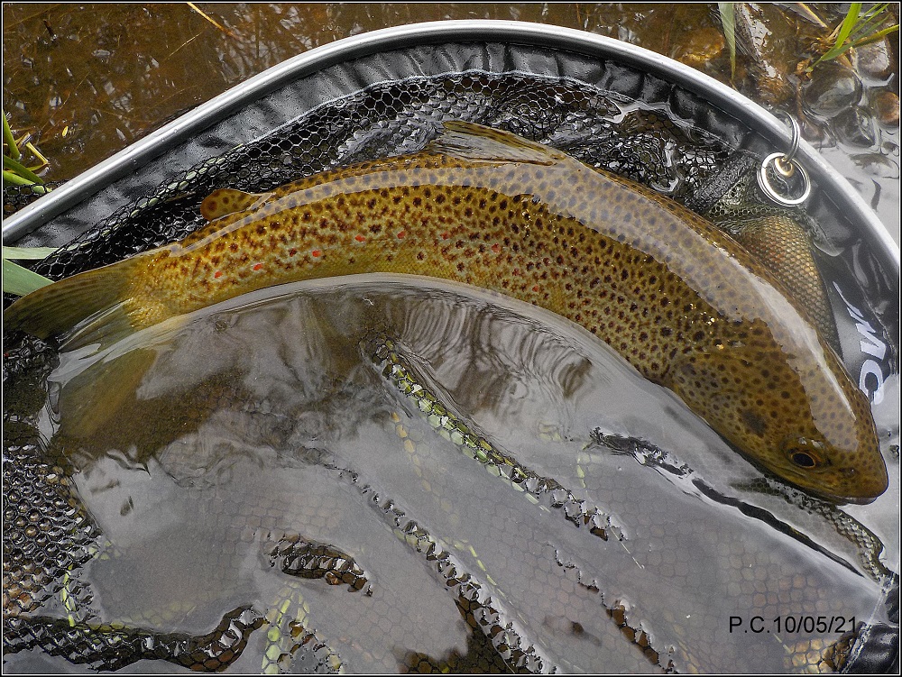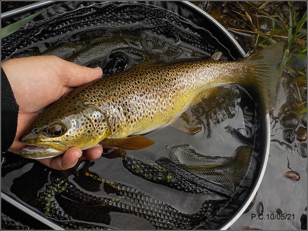 J’aperçois un autre gobage, poisson posté et opportuniste, reconfection de la pointe et avant pointe, le raccord au niveau du micro anneau est « limite », je refais, une 15mn à tout préparer …Et je présente cette imitation qui me réussit, la dérive est pas mal, la longueur du BDL permet de corriger et d’éviter le dragage…Montée et ferrage avec un léger retard, pour éviter « un raté »…et là je met à l’épuisette un superbe sujet …