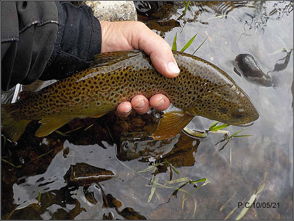 Paradoxalement au hasard d’un micro climat, j’arrive sur le spot ou des ronds me donne le sourire…J’attaque, poissons classiques mais un peu au dessus de la taille standard 25/32…De bon augure…Puis plus rien de chez plus rien, je m’apprête à rentrer …mais je pense à ces mois de « non pêche », inhérent au covid …je continue …et j’aperçois un gobage, digne du Gerris (au passage un petit bonjour à Laetitia) et là je refais ma pointe…et je ne me pose pas de question …Premier poser et prise, la truite file, je vois le « running line » partir plein pot en amont, il n’y a rien à faire, la Marryat travaille, le frein, travaille, l’hameçon est bon, mais la truite se décroche …