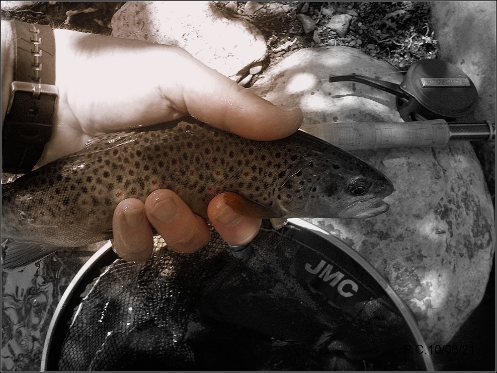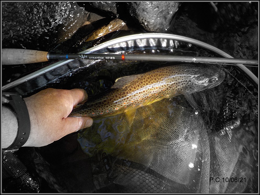 La pêche, en étant au bon moment, je remercie Mme , si je suis arrivé tôt .Effectivement, 2 voitures font demi tour quand il voit la Log…garée..et il ont bien raison, toutes mes veines sont exploitées , et me procure cette belle fario ..
