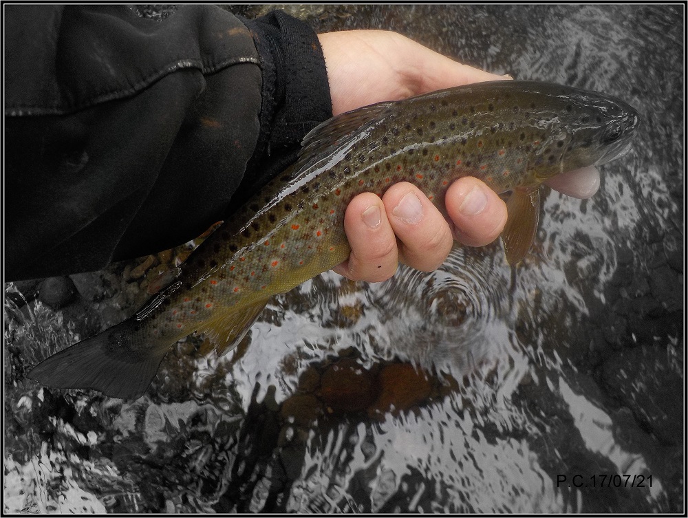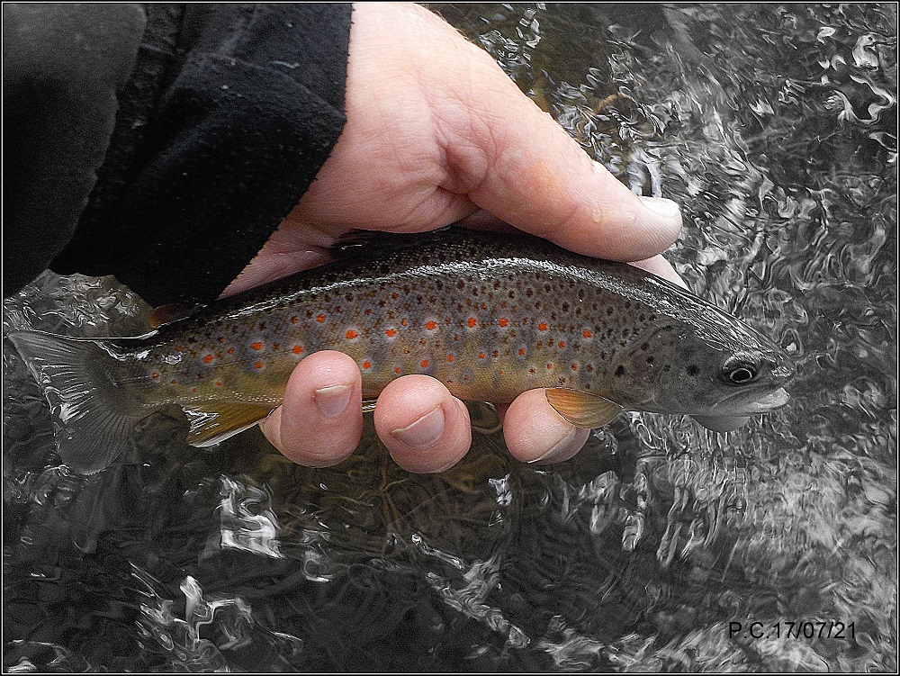Coté matos, une 8/9 pieds pour la sèche est ce que j’utilisais …Mais j’ai décidé de prospecter le spot « du Pépé de la Montagne » en perdigons, les truites d’ici n’en n’ont jamais vu… »Le Pépé de la Montagne », non plus…Je frappe à la porte, j’entends une voix rauque me répondre « Entrez »…Du haut de ces 90 ans, il me dit « prend une bière » et nous parlons un peu de pêche…Il en a secoué le « Pépé de la Montagne » des poissons…La gestion s’avérait patrimoniale avant l’heure, le prélèvement était raisonné, et alimentaire à cette époque! Je laisse « Le Pépé de la Montagne « qui me dit avoir mis le poêle pour le 14 Juillet, il fait froid cette année … (Bon Anniversaire pour ses 90 ans).
