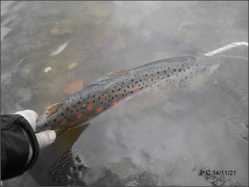 Je pose mon imitation quelques cinquante centimètres à proximité du, des gobages devrais je dire …Un gros remous, mais sans prise de l’imitation, je fais patiner la mouche et j’adore ce moment, quand je vois le sillage suivre celle-ci, la gueule s’ouvre et se referme, léger ferrage pour ne pas casser et une autre grosse fario vient se faire tirer le portrait…