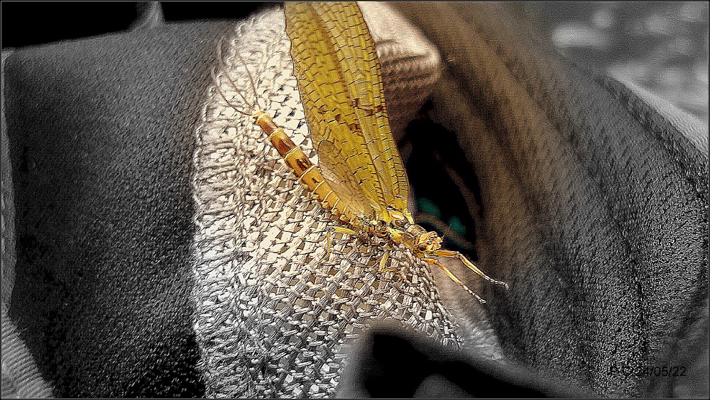 Je vous livre l’imitation conçue; tant par les ailes, que le thorax avec les traits marrons en fin d’abdomen , le thorax et la tête me font valider cette création, je remercie mon ami Eric L. pour ces hameçons …