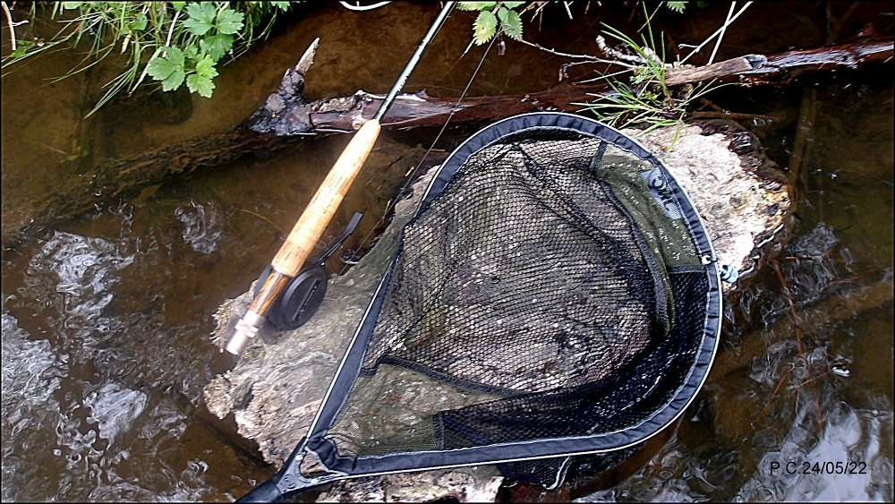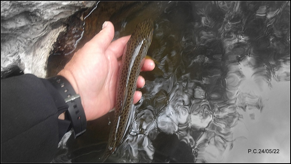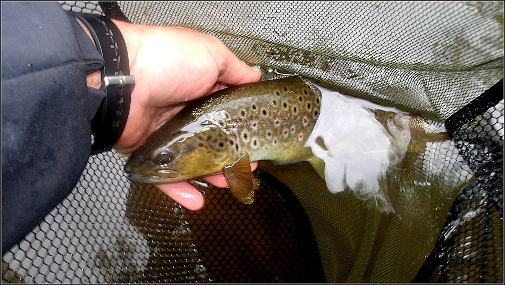 Splendide fario qui m’est passée entre les jambes et qui est remontée par le coté extérieure de la chaussure de Wading, pour finir dans l’épuisette , un grand moment, heureusement personne pour observer ;))