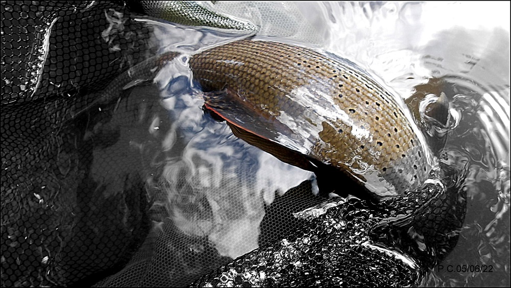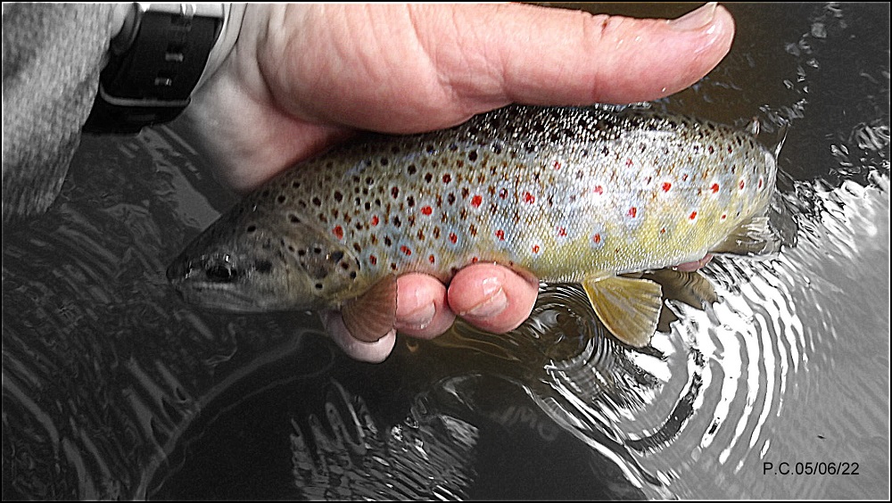 Réveil à 06h00, la pluie et les orages s’arrêtent juste, je rejoins mon ami Philibert pour une sortie prévue, les eaux sont marrons sur la plupart des rivières et nous savons que la pêche sera délicate, cependant par expérience, je me remémore de belles prises sur ce secteur même par eaux teintées. La pluie s’est arrêtée quand nous arrivons sur le spot. A cette époque les truites sont actives en surface mais là aucune activité, aucune mouche du reste pour les faire bouger…J’alterne sèche et nymphe et c’est en nymphe que nous prenons deux trois truitelles autrement dire une belle misère avant le casse croute. Nous remontons doucement la rivière, l’eau s’éclaircie doucement, une timide et sporadique éclosion d’eccdyo, sedge et mouche de Mai m’a incité à repasser en sèche. Un gobage une petite , deux gobages une autre petite…Puis sous les frondaisons trois beaux gobages, la truite est un peu plus sérieuse, seulement il faut passer dessous la végétation, à la cinquième tentatives l’imitation de MDM passent a une dizaine de centimètres du gobage, mais par chance la truite est affamée et bonne fille et vient happer la mouche, ce qui ne sera pas le cas d’ici quelques semaines . Une belle défense et épuisette pour une séance photo.