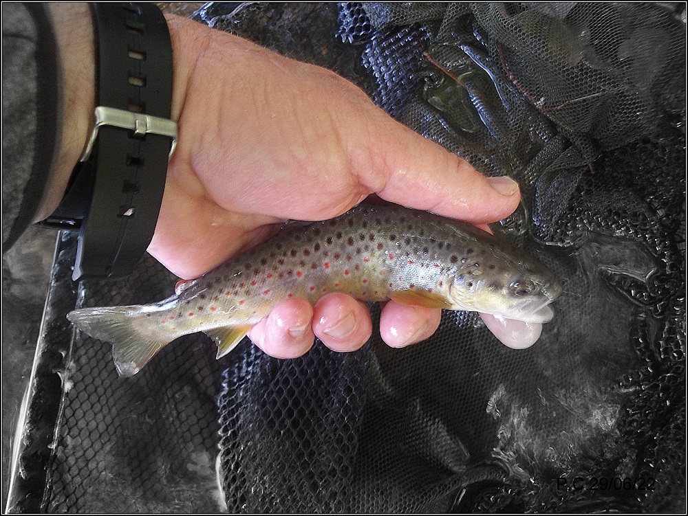 Des pêcheurs habitués des eaux fortes profitent au lombric ou cuiller, ce qui complique ma sortie …Mais je trouve la pêche, seuls les « riquettes » sont dehors et je m’en satisfais aux regard des conditions d’autant plus que la chaleur revient …