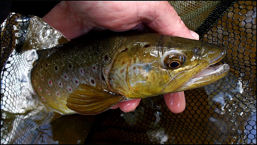 Un gobage observé demande de la méthode ; visualiser la veine précise, l’approche, le positionnement, une présentation de la bonne imitation et une dérive parfaite; une évidence. Quant tout est réuni, la truite monte, le ferrage doit être dans le timing à la fois ferme et souple, sans violence pour éviter la casse. Ramener la truite à l’épuisette en se plaçant en aval du poisson ……..