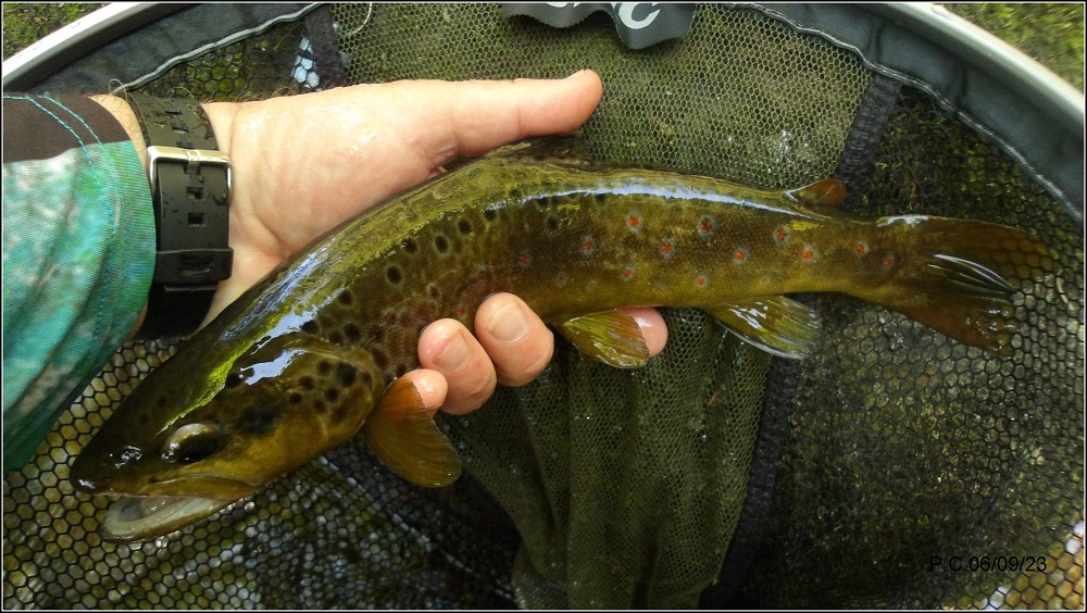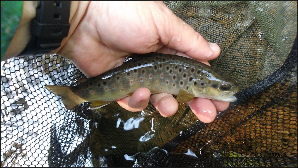 Première petite truite bien vive qui s’est ruée sur la nymphe, les points noirs plus nombreux que les truites de la Sioule sont à remarquer.