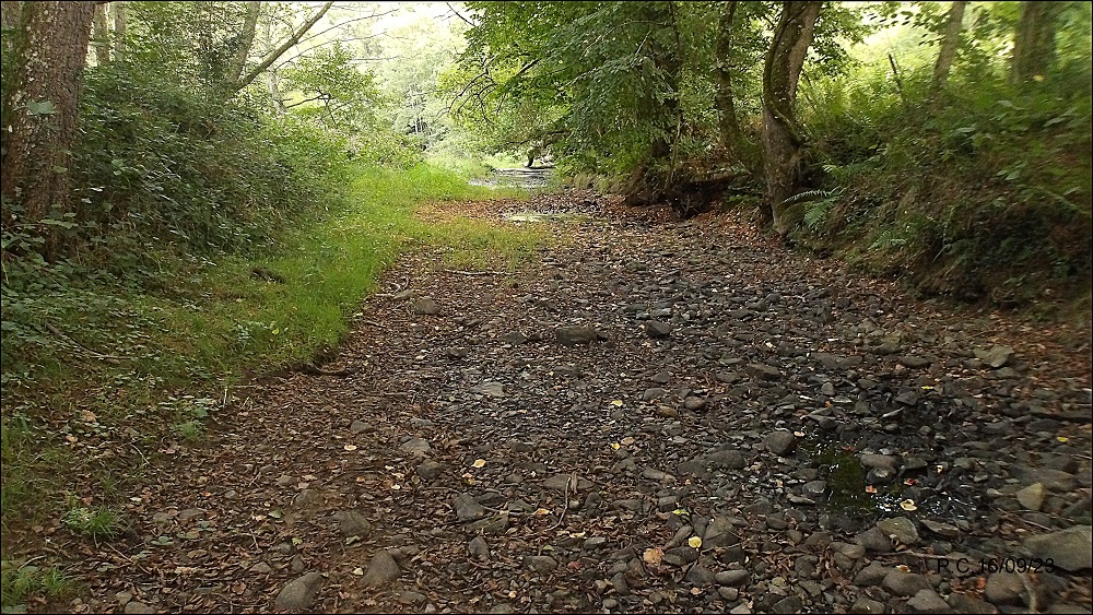 Un des bras de la Sioule à sec; de l’eau à mi genou normalement, les 2.9 m3 régulièrement affichés témoigne d’un avenir bien pessimiste à moins d’un miracle. La thermie catastrophique de cette canicule tardive fait souffrir la Sioule .Il en est de même sur les rivières proches tel l’Alagnon, qui souffre déjà de travaux .