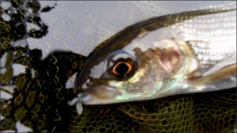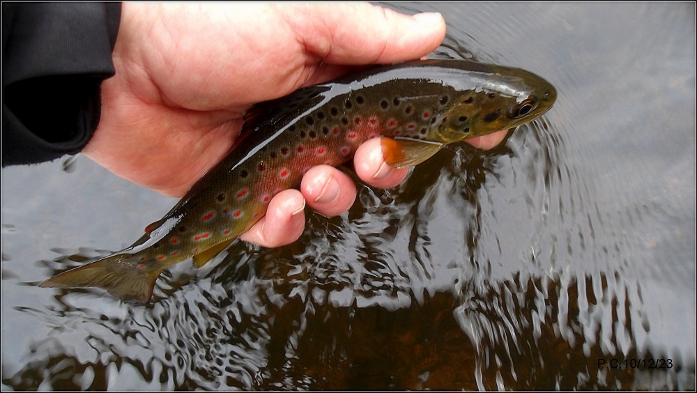 La rivière est encombrée de branches tombées sous les violentes rafales de vent et je laisse plusieurs nymphes. Le créneau est court à cet époque nous sommes en hiver. Aucune touche d’ombres, seule cette truite s’est emparée de ma perdigone.