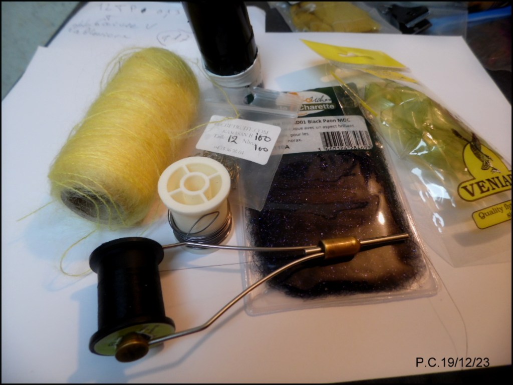 Ci dessous liste et photo des matériaux utilisés; Hameçon courbe 10/12, body strecht olive, laine mohair jaune paille, ice dub black and paon , fil de plomb ,fil fin de cuivre.