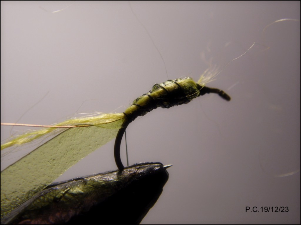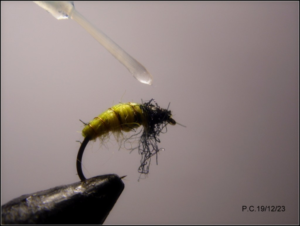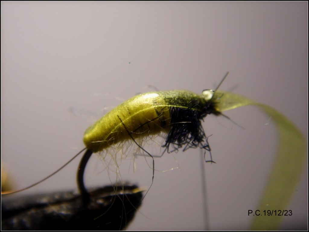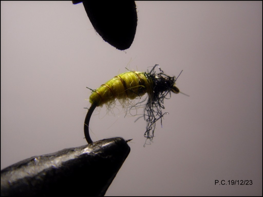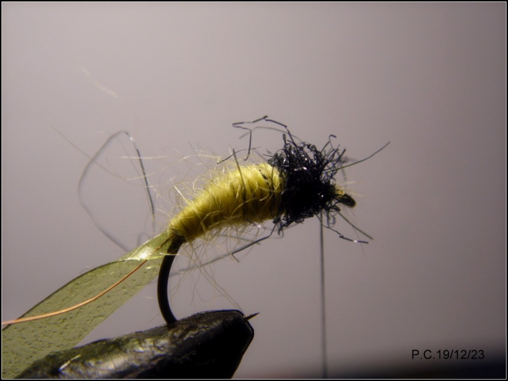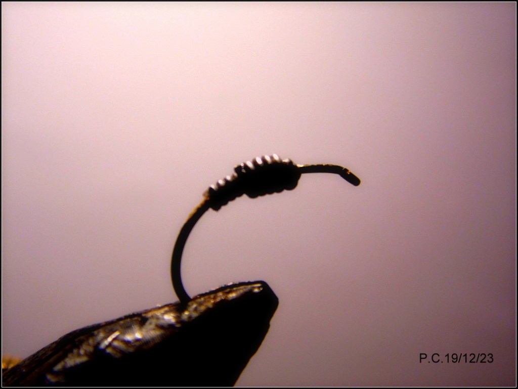 Un deuxième montage inspiré du Czech tying avec ce modèle sensé imité un porte bois; pupa de trichoptère. Les sedges sont représentatifs des insectes que l’on trouve en abondance sur La Sioule, ce stade est intéressant à utiliser en Nymph au fil. Il peut trouver sa place dans un train de noyées .