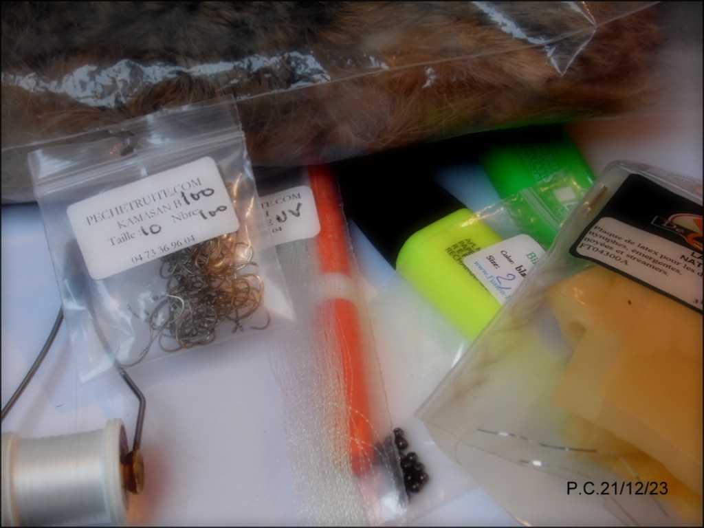 Ci dessous liste des matériaux , billes tungstène noires, H courbes N°10, soie de montage blanche 8/0,masque de lièvre, cristal hair nacre, latex naturel, marqueurs selon la couleur voulue, résine UV.