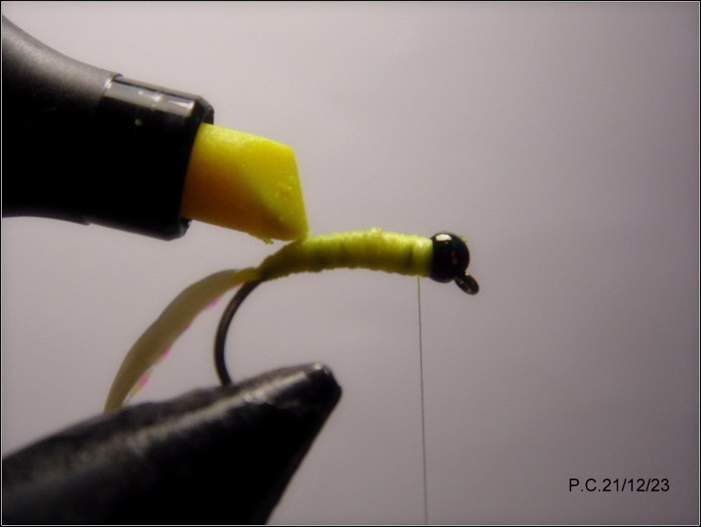Aprés avoir préformé le corps avec la soie de montage blanche coloriez selon votre choix, jaune dans ce cas.