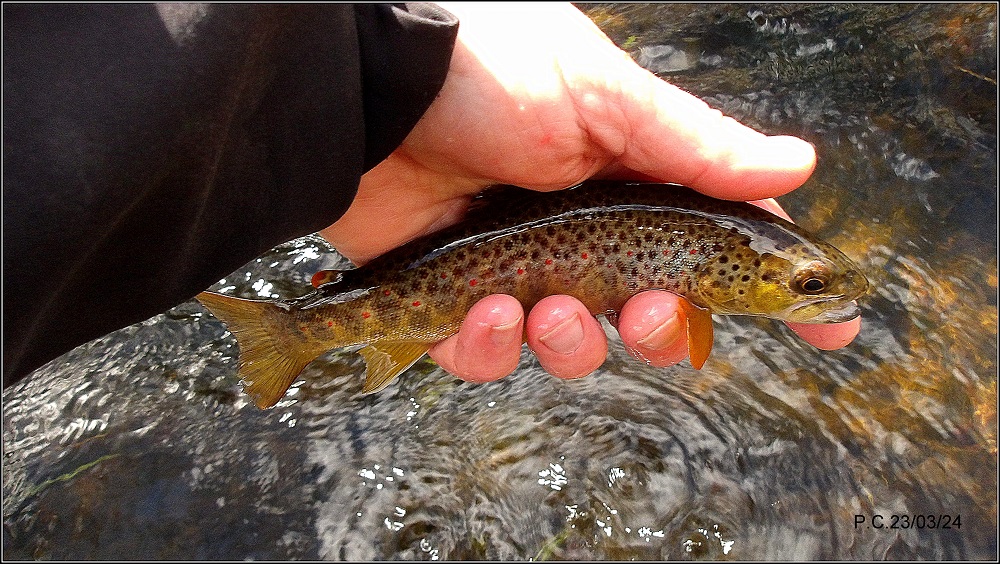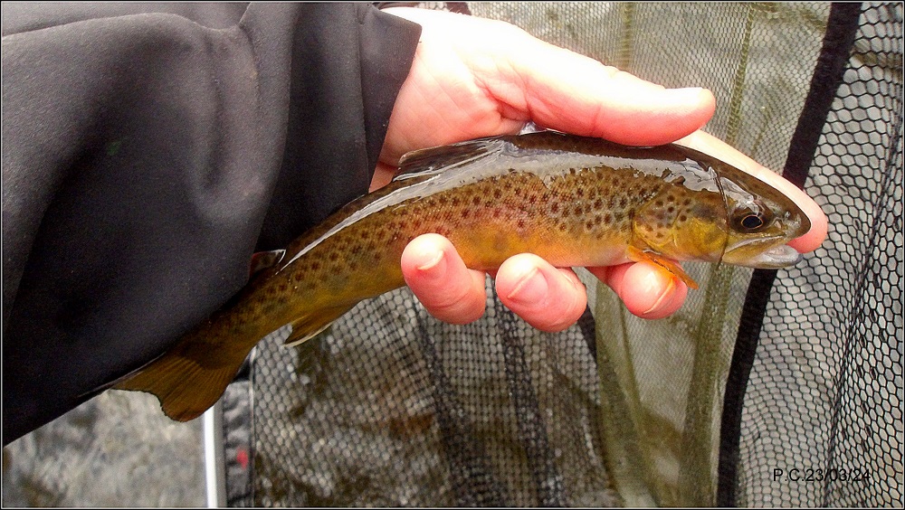 Une éclosion de March Brown, deux timides gobages qui me font passer en sèche mais sans succès.. En semi plaqué pour effectuer une dérive le plus propre possible face au vent glacial qui s’est levé. Mon application et ténacité sont récompensés.