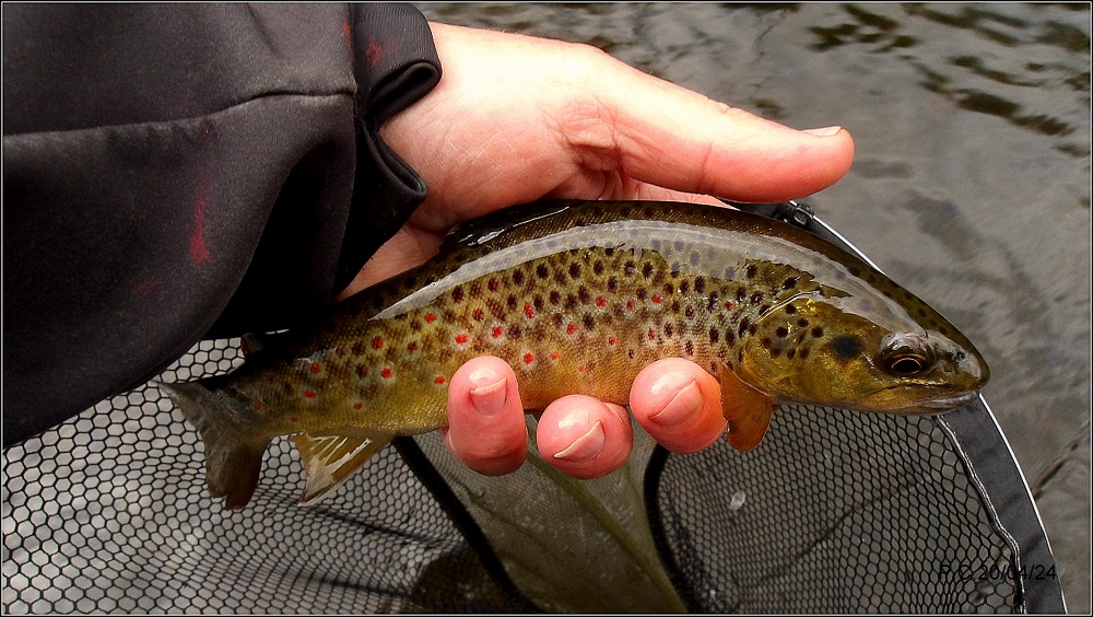 Les prises s’enchainent poissons modestes 25/27cm mais enfin la saison démarre et la pêche à la mouche retrouve ses lettres de noblesse. Je décroche, un beau poisson mais comme antan un autre n’est pas loin, je soigne ma dérive et malgré le vent j’arrive à passer correctement, montée franche et une belle truite de la Sioule vient poser pour la photo. Le Maya truite affiche 33cm.