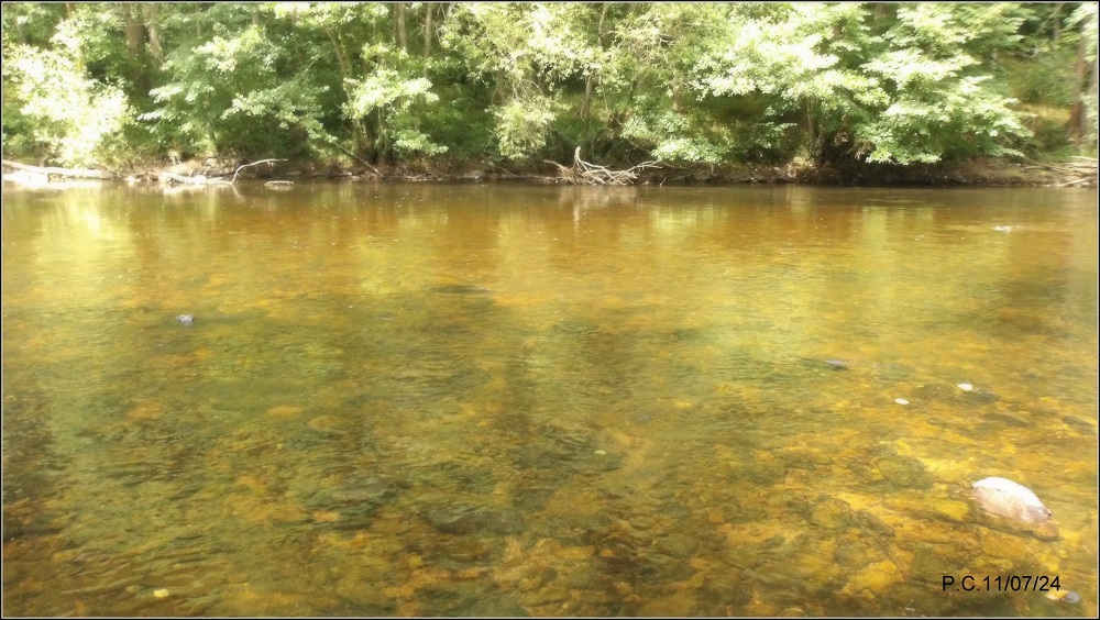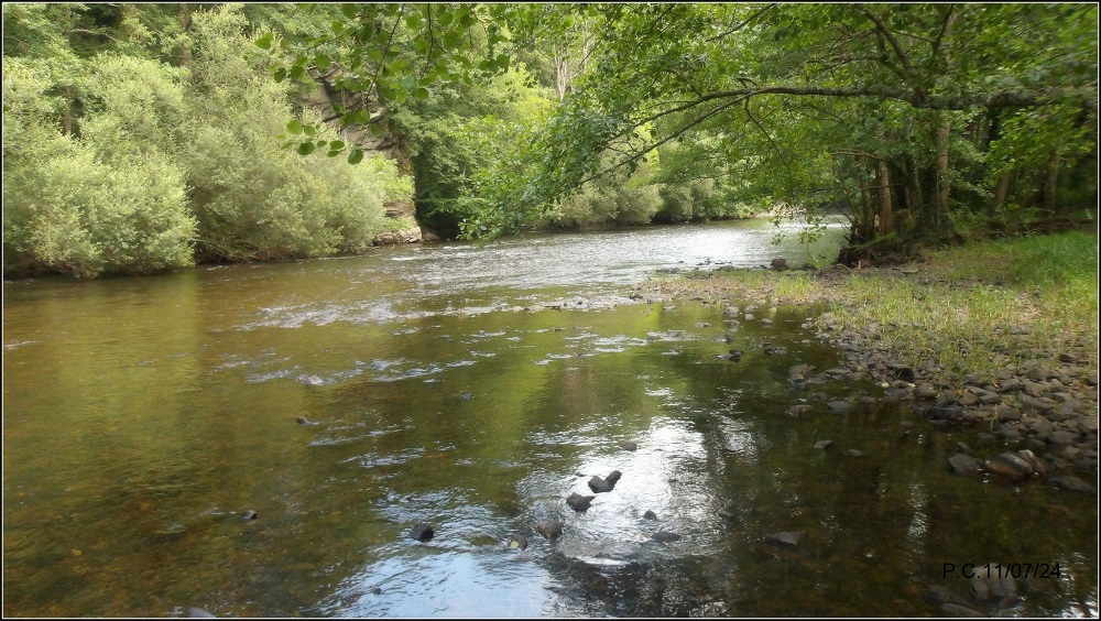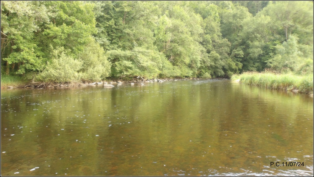La Sioule affiche 4.1 m3 et les kayaks aprés une longue disette s’en donnent logiquement à cœur joie. Je constate une nette amélioration dans la cohabitation, témoin ces jeunes qui me demandent si ils font bien , pas de pagaie, passage loin du pêcheur, merci aux moniteurs.