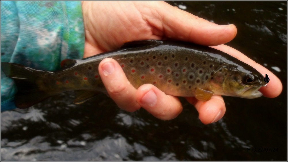 Bien à l’ombre c’est en nymphe que je prospecte, une truite pas énorme mais assez récalcitrante vient pour la pose photo.
