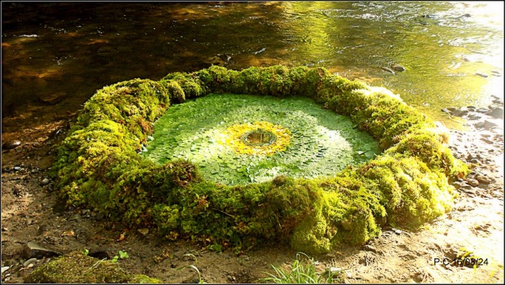 Je tombe sur cette création des plus originale, cercle en pierre recouvertes de mousse, rempli d’eau , dégradé de feuilles verte puis jaune puis de l’eau claire …