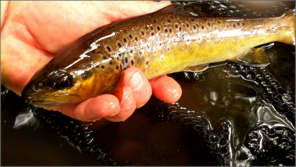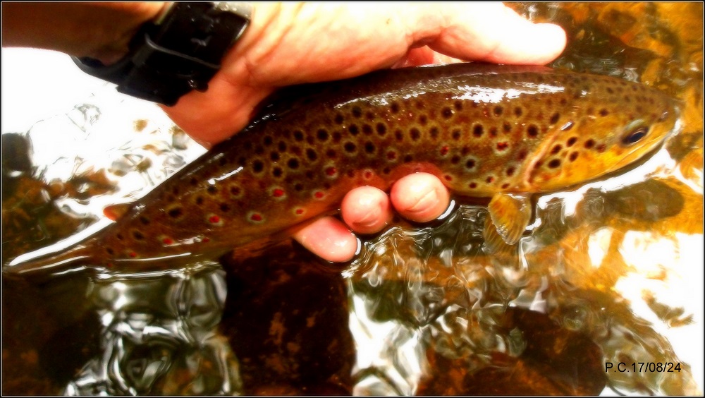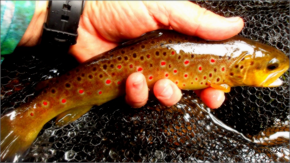 Montée rapide ferrage et une belle truite toute surprise rejoint l’épuisette .