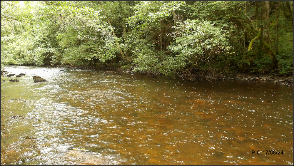 La pluie revient et cette fois ce n’est pas une averse, je remet la veste . Je pêche l’eau et le début du courant, un beau gobage, la truite file sur la berge opposée…
