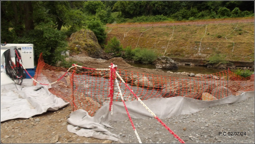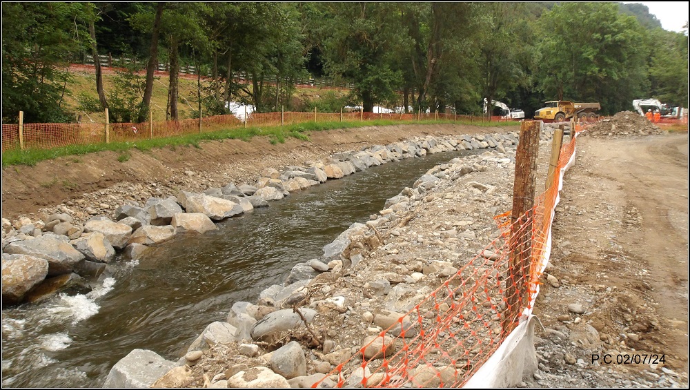Une image prise en me faisant gentiment éconduire du chantier en Juillet , il s’agit d’une dérivation de l’Alagnon située derrière les arbres , vous remarquerez en haut une pelleteuse qui creuse dans la rivière .J’émet de fortes réserves sur la continuité écologique et la pérennisation de Thymallus Ligericus sur ce secteur à mi hauteur des arbres la barrière verte c’est la ligne SNCF. Plusieurs secteurs sont en travaux, peu être que l’idée d’étaler les travaux aurait été judicieux.