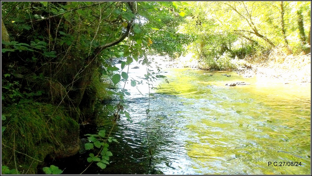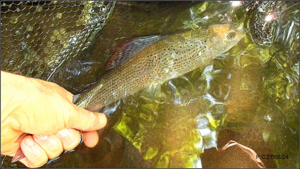 Une fois de plus c’est directement en sortant de ma nuit de travail que je me rends sur cette rivière magique qu’est l’Alagnon défigurée sur certain secteurs par les travaux de soubassement de la voie ferrée .La fraicheur du matin 9° fait vite place à la chaleur, l’amplitude de température ne sera pas un atout , tout comme la lumière du soleil et ses UV dont il faut se protéger. Mon spot à Thymallus est enfin en vue mais aprés une demi heure d’essais divers je dois me rendre à l’évidence ils n’en veulent pas, je passe au dessus sur un autre spot ou Ligericus se fait des fois surprendre mais toujours rien, une truite tape et se saisit de ma nymphe pas énorme et de toute façon ce n’est pas pour elle que je viens. Je cherche et découvre cette petite veine sous les feuilles bien au frais et …