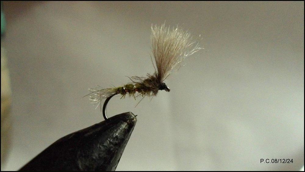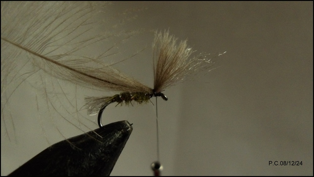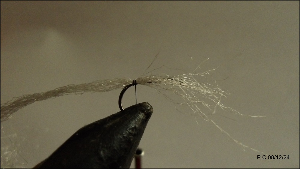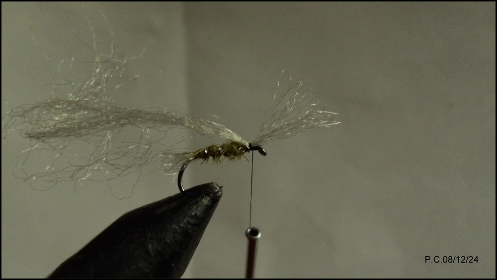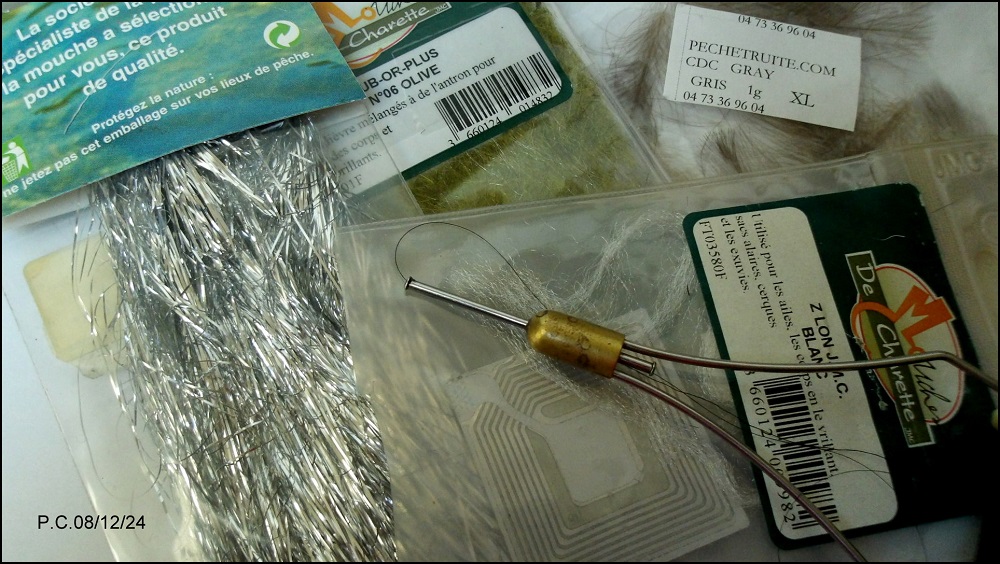 Flashabou argent, Ice dub OR Plus Olive, CDC, Z-Lon Blanc.Soie de montage noire 14/0,H14.