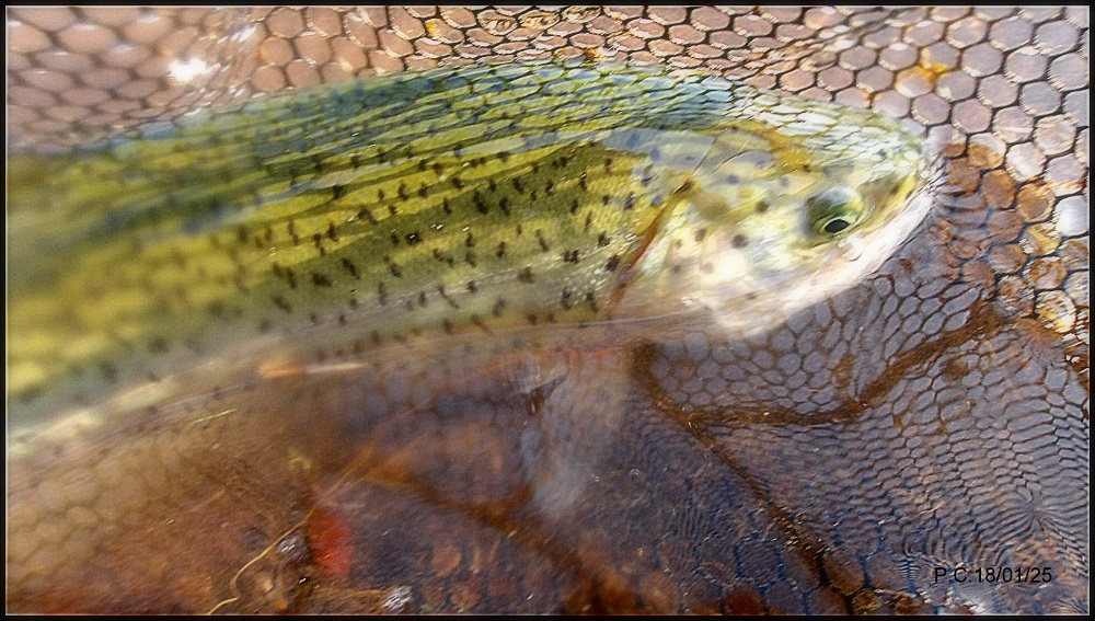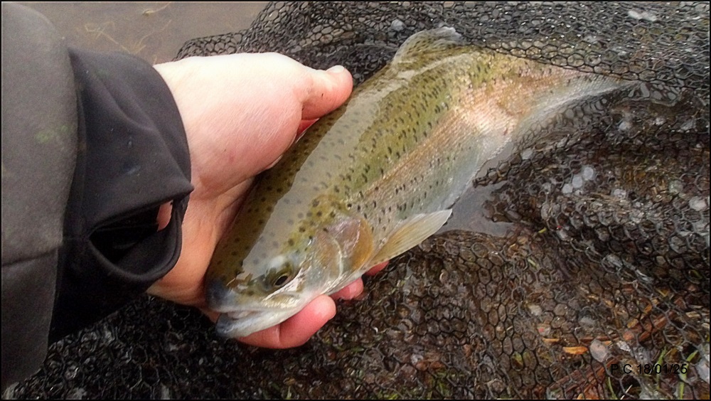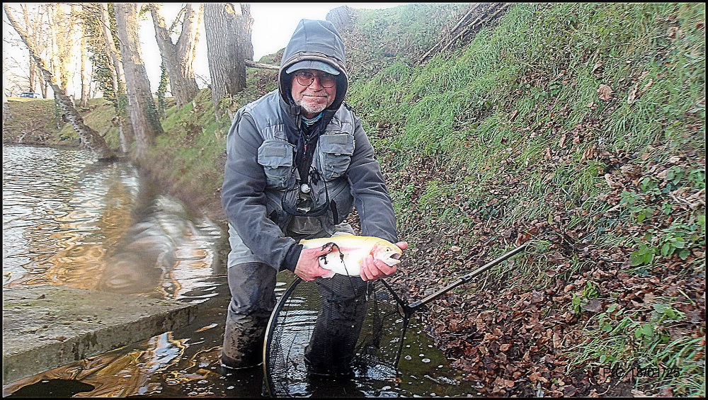 Le froid pique lorsque j’attaque ma session de pêche, mais il fera beau, peu être trop beau. Peu de poissons à pécher à vue, en scrutant l’eau je constate que les arcs sont en maraudes mais plus profondément. J’ai réduit mon matériel avec une canne au streamer ligne flottante et une plongeante. Violente tape et s’en suit le premier poisson de l’année qui lance ma saison pêche.