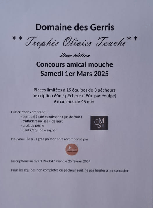 Pour info il reste de la place pour le concours , auquel je ne pourrais prendre part pour raisons professionnelles et AG d’AAPPMA .