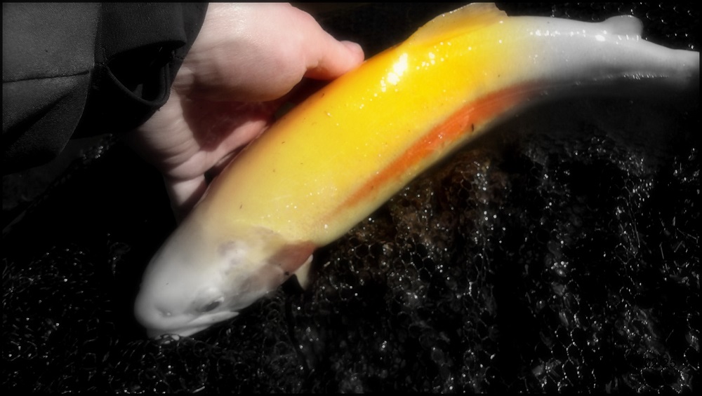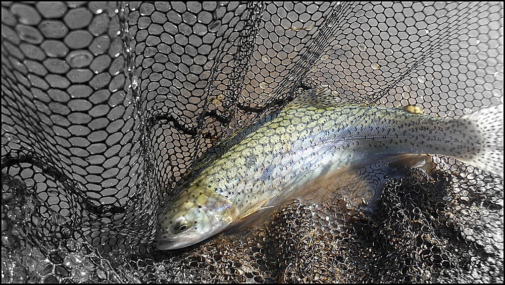 Je vois une jaune suivre et ignorer le streamer;, passage en nymphe et finalement une arc qui s’empare de la nymphe , rush de 10 mètres et casse , je n’ai pas voulu changé ma pointe et aprés quelques belles prises la résistance est amoindrie et pas de détail …Je refais la pointe soigneusement et relance la nymphe suivie de son pompon, léger frémissement de l’indicateur , ferrage mais la truite a recraché. Je lance de nouveau léger frémissement mais ferrage plus rapide tout en restant souple et cette fois l’arc se démène avant de finir pour la pause photo et repartir