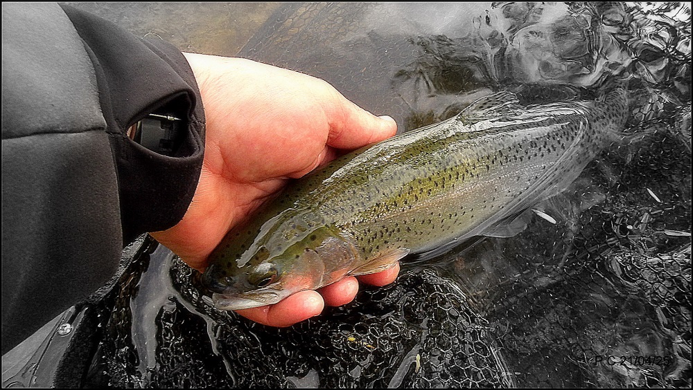 Une grosse averse, les chiros et sedges sont sur l’eau mais rien de rien en surface. Je continue au stream quand une grosse agua passe à proximité , je redresse le tir, la soie file, le stream coule aprés un amorti afin de ne pas trop effrayer le poisson, celui ci tourne la tête et se dirige dessus sans hâte, mais ce comportement est sans ambiguïté, le stream est pris …
