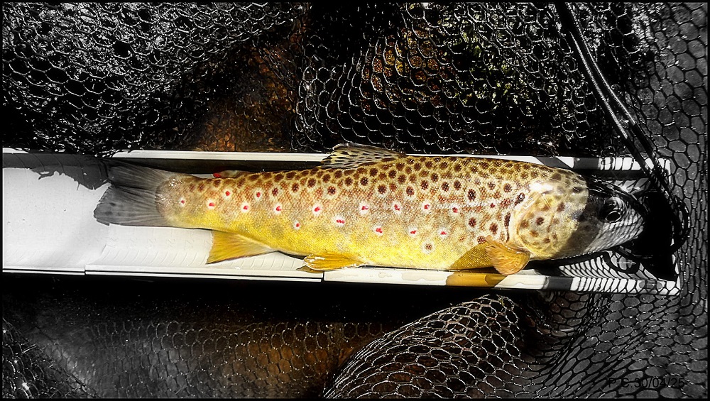 Peu de temps aprés je relève la canne, touche induite, une autre belle fario.