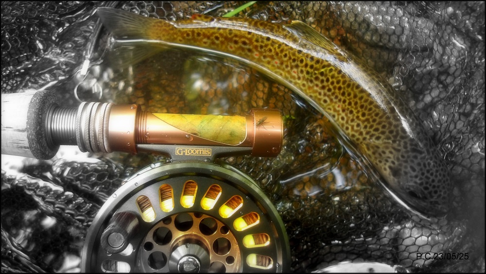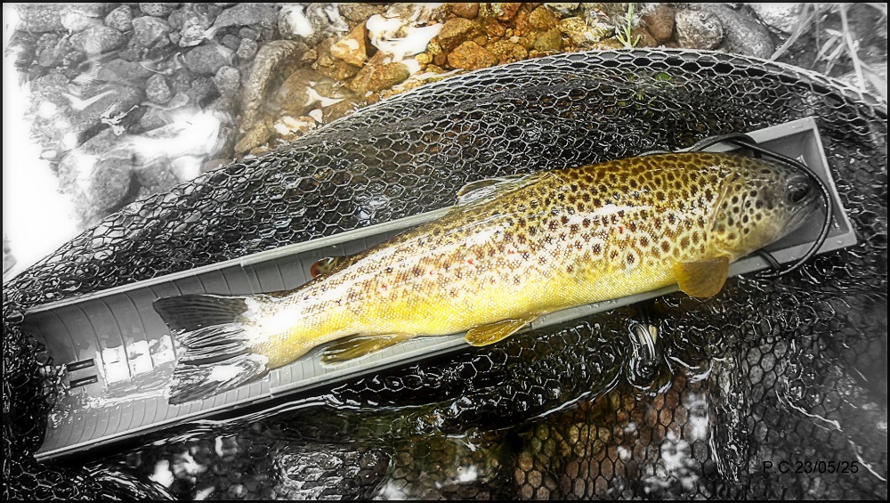 Ce Vendredi, J’arrive vers midi sur le spot, des poissons pris en nymphe sans être énormes mais bien agréables, je change de direction et me décide pour faire un peu de marche, histoire d’éliminer la terrine du casse croute…Arrivé sur le coup je refais ma pointe et réajuste l’écartement un peu court entre mes nymphes, (pour les nouveaux venus il s’agit de revenir à la base d’écartement, cette base est purement personnelle et en fait il s’agit de celle qui en moyenne à rapporté le plus de poissons à un moment donné).Tout en faisant ce montage je garde un œil sur la rivière …et non je ne rêve pas, un gobage trente mètres plus bas, je fixe mon attention et re gobage, puis une autre fois. Pas d’hésitation je défais ma ligne nymphe pour changer de moulinet et passer en sèche. Le vent sensible m’embrouille, je refais une pointe noue une petite sèche et m’applique, un peu court , re gobage, ce coup là je suis pile dans la bonne veine, montée et ferrage instantané mais souple. Belle défense et une magnifique Fario rejoint l’épuisette.