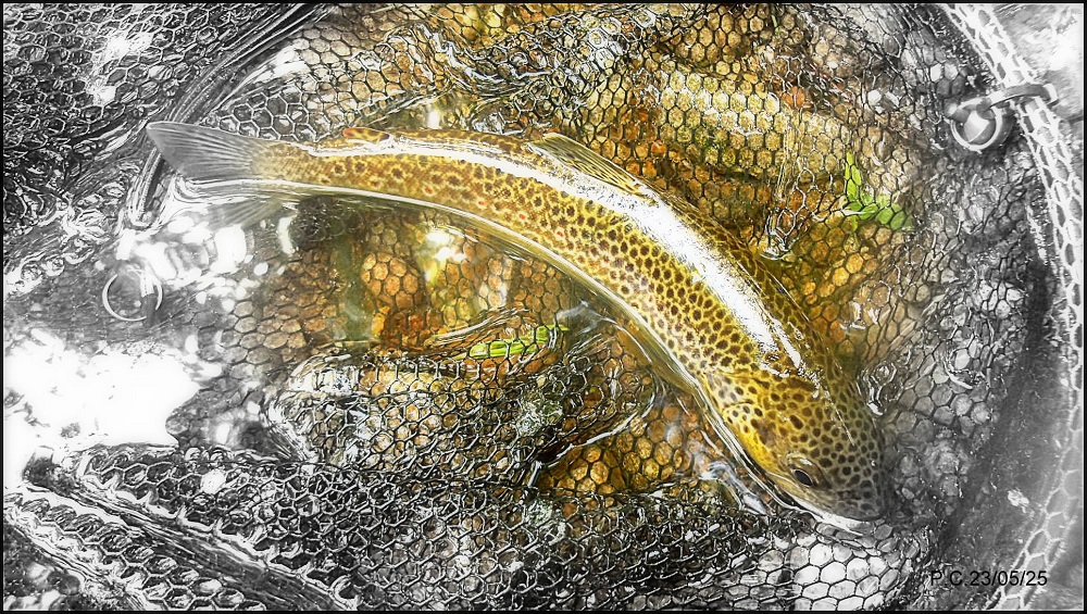 Trente deux au Maya truite, je suis content d’avoir pu remarquer ce gobage qui aurait pu passé inaperçu, si je n’avais pas refait ma pointe nymphe, il y a des fois ou cela veut bien faire…
