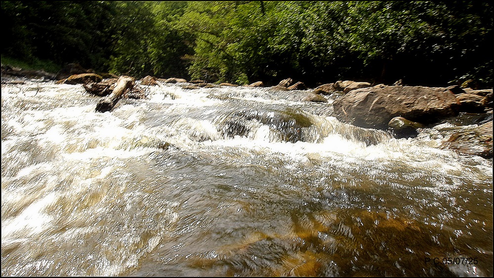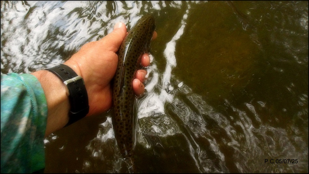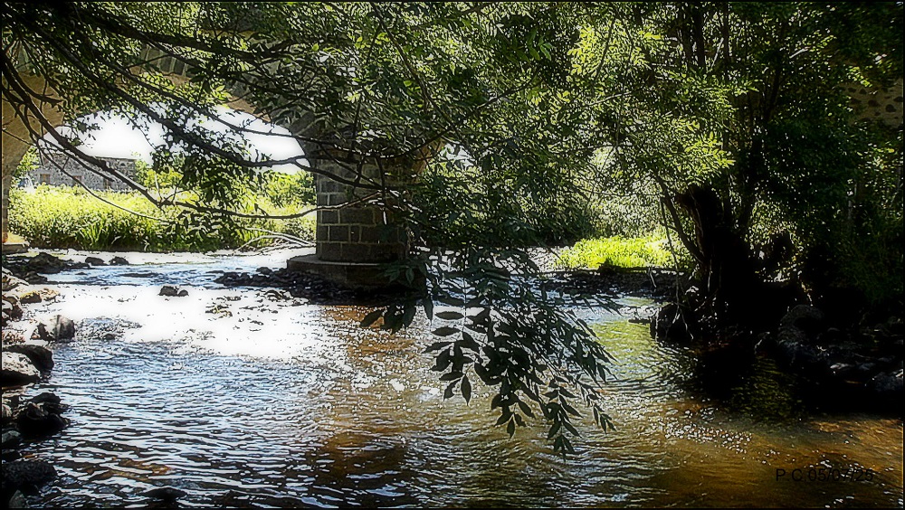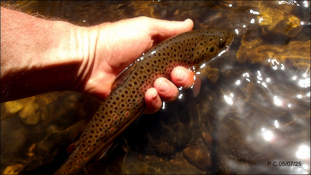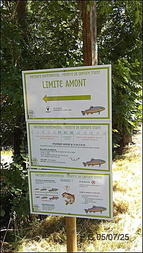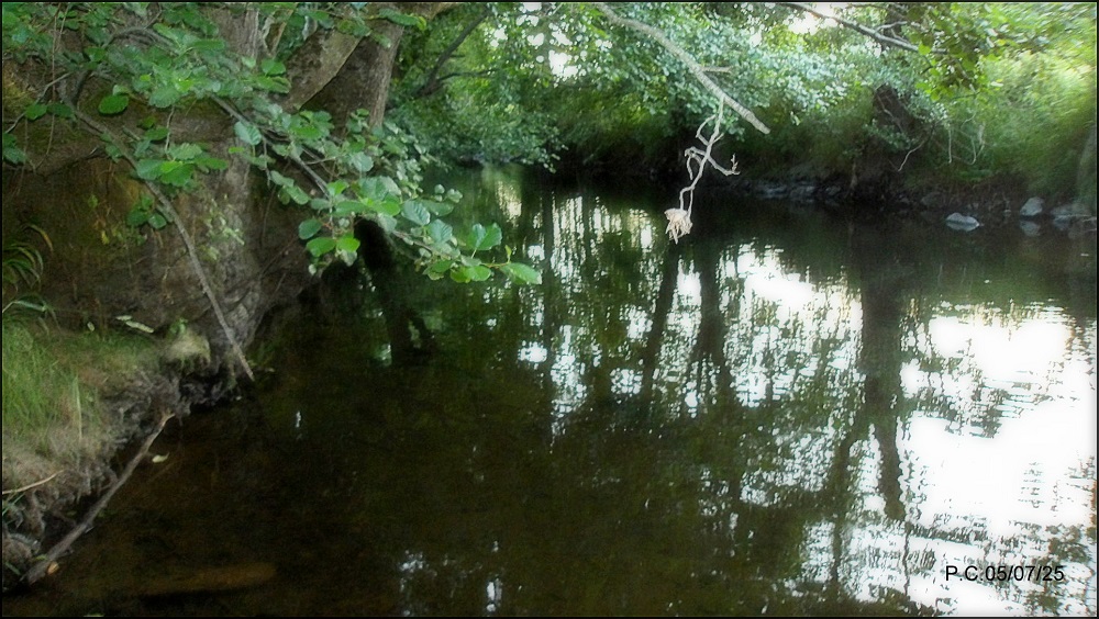 Je fais une tentative malgré la chaleur sur le secteur .(soyez prudent et regardez en l’air ligne électrique à faible hauteur en aval du pont , sur la veine bien sur prometteuse ). Une truite de 23 prendra la nymphe et je n’irais pas plus loin, un couple s’est arrêté et a jeté leur chien à l’eau, histoire de le rafraichir, ils s’excusent, ne m’ayant pas vu. Je reviendrais à une période plus favorable, au printemps sans aucun doute, juste aprés l’ouverture de l’ombre.