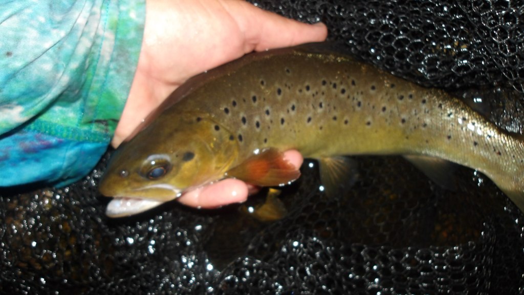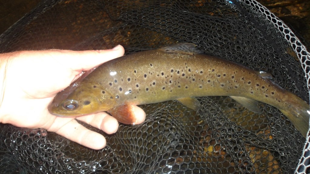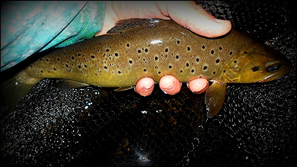 Je suis en poste au même endroit qu’hier, un gobage puis deux , en dix centièmes petit CDC , mais ce sont vandoises et tacons. Puis vers 21h15 les mannes sortent, moins nombreuses que la veille et pas un gobage , rien de rien. Je grimace, je regarde ma monte en pêchant l’eau, une prise , mais décrochée , un bel ombre dommage.21H30 un beau gobage j’essuie mon imitation afin de bien la voire. Un passage , puis deux , puis ferrage et une belle truite se saisit de mon imitation, en 14 je suis serein et épuisette pour une photo.