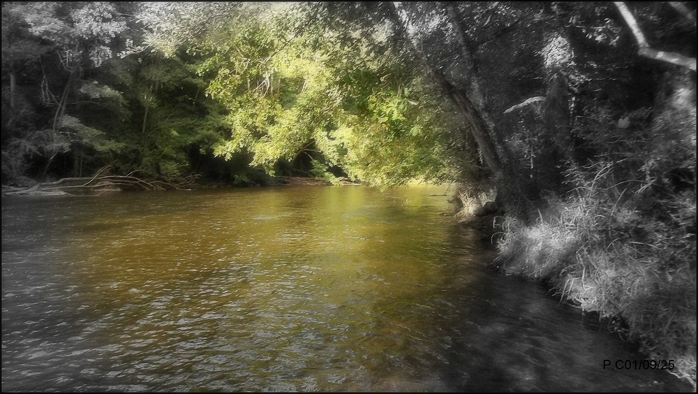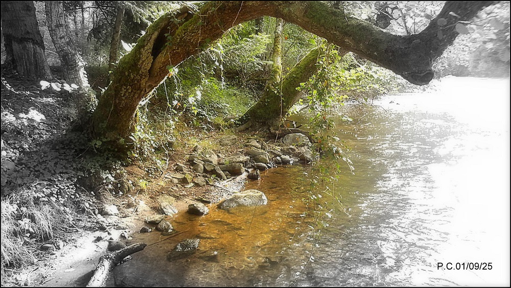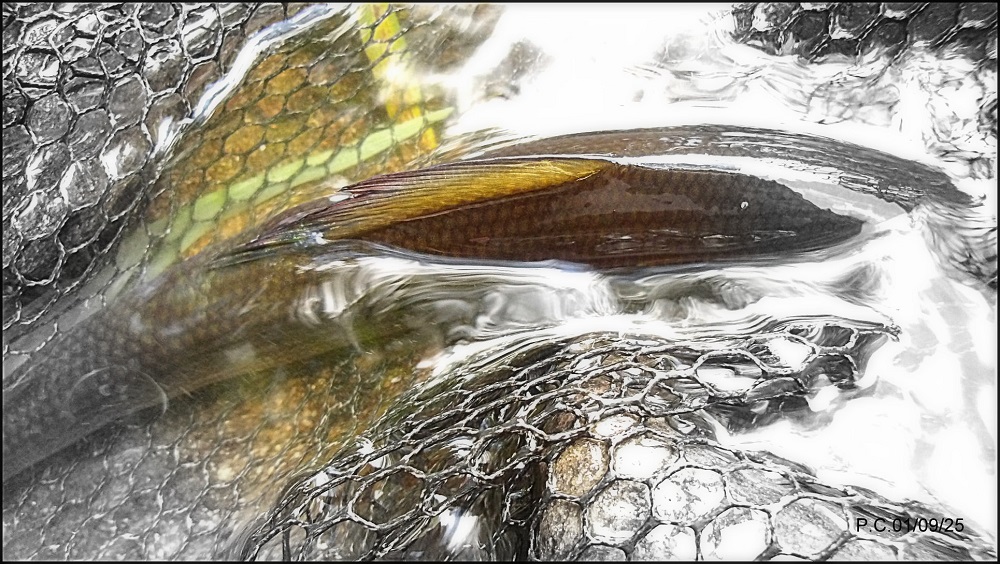 Deux jours de pluie, enfin , de la bonne pluie d’orage non dévastateur, la vallée respire un peu. Allez les derniers quinze jours avant la fermeture, au fil du temps, le temps va, inexorablement va, encore une saison qui se termine. Histoire d’aller chercher une fario et Thymallus surtout lui. L’eau est marron, bonne pour les lombrics, aucune activité de surface au regard d’une hypothétique éclosion qui n’arrive pas, c’est en nymphe classique que je prospecte le spot, un compère est un peu amont mais il m’a bien laisser la distance de correction qui me permet de pêcher sereinement. Une truite estimée à trente est décrochée, « riquettes » de 25, ombrets, pas grand chose seul ce sujet gratifiera la session.