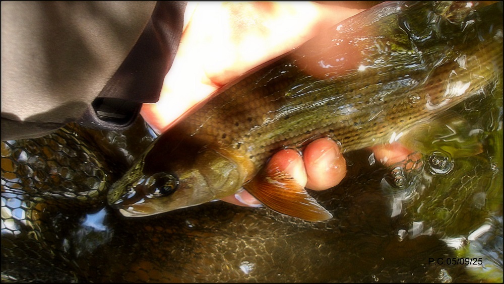 Encore de bonnes pluies ces derniers jour, la rivière affiche une couleur marron, direction le secteur de mon ami Jean Paul… Une connaissance est sur le spot en nymphe au toc; un moment d’échange, avant d’aller sur un de mes coins de prédilection. Je commence par prospecter léger sur la bordure mais rien ne répond. J’opte pour une pêche lourde en plein bouillon et aprés quelques réglages arrêt, dévalaison, le poisson et bien pris, je suis en 11.7/centième , pas de pièges ou autre branche en vue , épuisetage rapide .