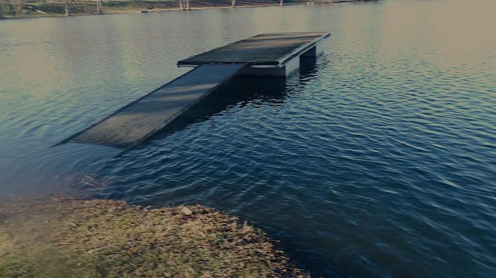Quelques pêcheurs, je vois mettre au sec une arc, je prends le café et monte deux cannes et c’est parti pour une après midi de pêche. La neige est tombée dans la semaine, les forts débits de l’Allier on fait remonter par infiltration le niveau du lac . Comme vous pouvez le voir ci dessous les pontons sont immergés, prévoir des cuissardes pour accéder à ceux ci . C’est à proximité de celui ci que je ferais ma pêche au streamer. Je vois les arcs suivre et s’élancer de puis un mètre pour s’emparer du montage en marabout. Des poissons fraichement introduits qui vendent chèrement leur peau.