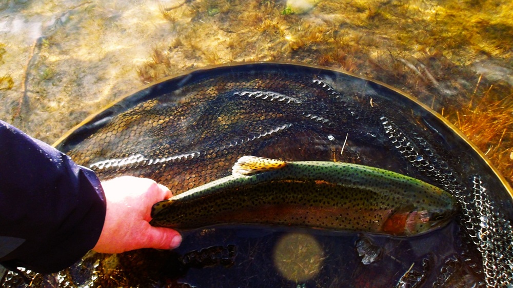 Le temps se couvre et une averse de grésille met à mal le moral des pêcheurs , mais une éclaircie revient et j’ai plusieurs suivis sans prises concrètes, sans doute une histoire d’animation ou d’éducation des poissons qui sont sollicités ce Samedi par la dizaine de moucheurs présents. Puis rien de rien, chacun s’en va au casse croute pour se réchauffer.