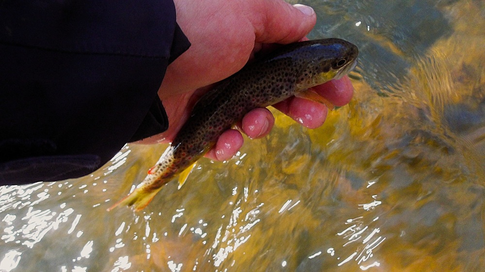 Je change radicalement de secteur pour me rendre sur un spot à une demi heure de marche mais qui sera au soleil donc plus chaud , après la classique nymphe accrochée au fond de l’eau, je trouve le bon lestage, mais le vent s’est levé et c’est en nymphe semi plaquée amont que je prospecte à la recherche d’une hypothétique truite dehors.