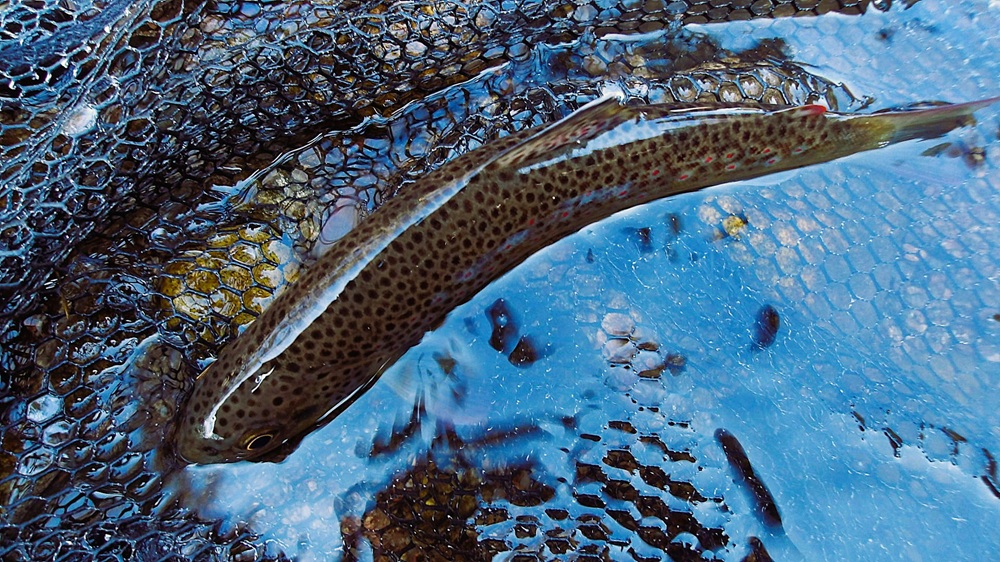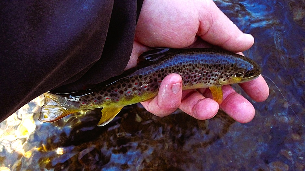 Un secteur qui nous déçoit car pas un poisson pris, vu que nous sommes deux, nous concluons que les truites ne sont pas dehors au regard de l’eau glacée et du soleil qui donne une lumière exacerbée peu favorable. De plus, le vent qui s’est levé complique la pêche, rendant chaque lancer plus difficile et moins précis. Je me rends donc sur le spot plus en amont, plus propice à mon avis, espérant y trouver des conditions plus favorables et une meilleure activité des poissons. Après une courte dérive, je suis enfin récompensé : une fario affamée s’est fait surprendre par mon imitation, se débattant avec énergie, avant la pause photo.
