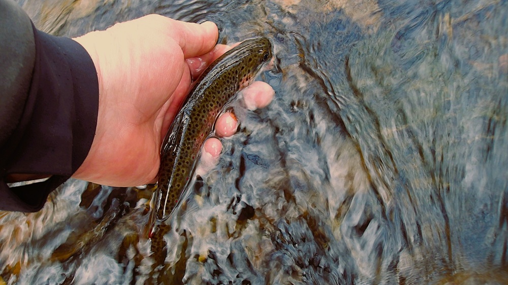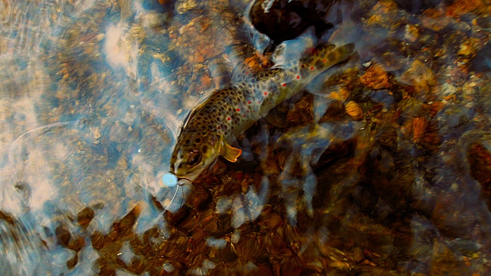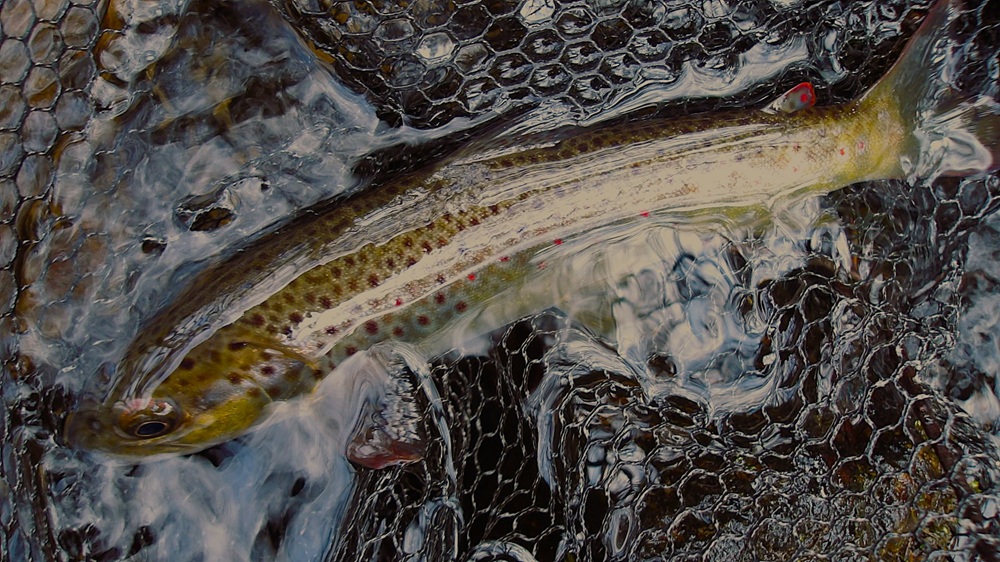 Comme je m’y attendais, la pêche est délicate, les poissons sont bien calés dans leurs cachettes de la rivière. Les courants s’entremêlent et rendent la tâche encore plus difficile, mais je ne renonce pas facilement. Chaque lancer de ligne est un nouvel espoir, une promesse de succès qui pourrait se réaliser à tout moment. Après de nombreuses tentatives laborieuses, enfin, une fario de la rivière se saisit de ma nymphe avec énergie. Elle se débat avec force avant de venir rejoindre l’épuisette.
