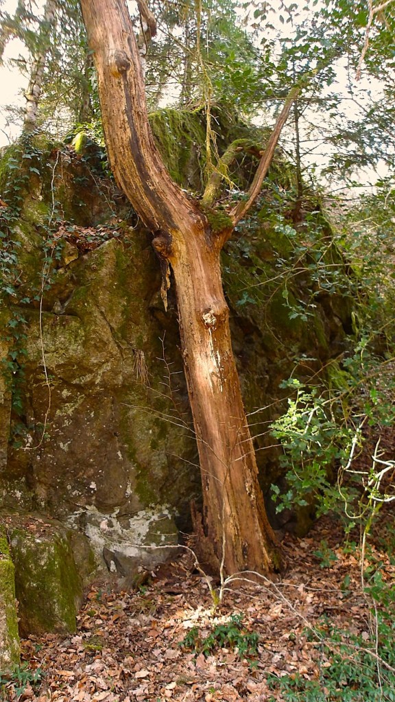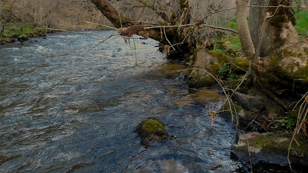 Alors que je suis bien au calme, un bruit suspect me déconcentre, qu’elle n’est pas ma surprise de voire un « quatre quatre » débouler sur la berge me dépasser s’arrêter un peu plus loin, le pêcheur sans se poser de question commence à lancer sa cuiller …Je traverse la rivière et décide de m’éloigner. Sur le petit sentier, je suis surpris par la nature qui affiche un spectacle surprenant. A l’abri derrière le bloc de granit , l’arbre s’accroche à la vie.