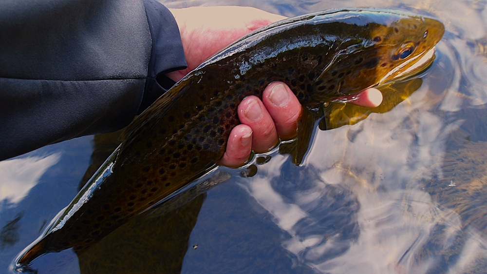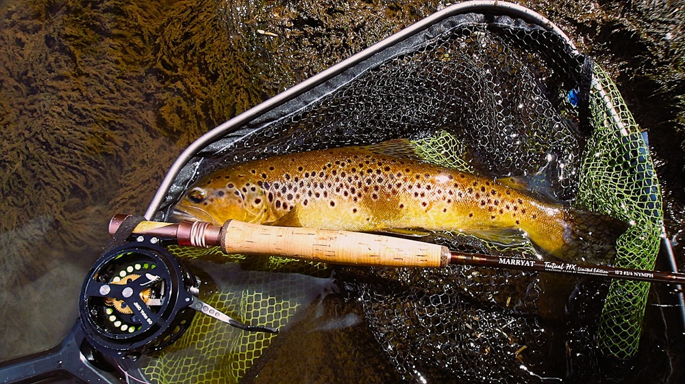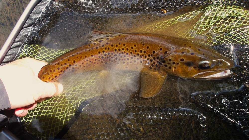 C’est finalement le Dimanche avant mon départ que La Rivière Espérance me fera un superbe cadeau dans les derniers mètres de ma session, j’y aurais cru désespérément jusqu’au bout. Remontant en fil plaqué depuis des heures ou rien de bien sérieux n’avait montré le bout de son museau, ARRET DU FIL et je vois une gosse Fario débouler plein pot devant moi sous la lumière du soleil, je n’ai pas ferré, craignant la casse du 11,7 centième, juste relevé la canne .Heureusement je ne suis pas en plein courant comme l’année dernière ou j’ai cassé un autre gros poisson, cependant ce n’est pas gagné et je ne veux pas perdre ce superbe poisson, après quatre manœuvres, je me rends compte que j’avais bien refais mes nœuds, pointe neuve, pas de précipitation , pas de faute, un peu de chance et EPUISETTE suivi d’un cri de joie qui résonne encore dans la vallée.